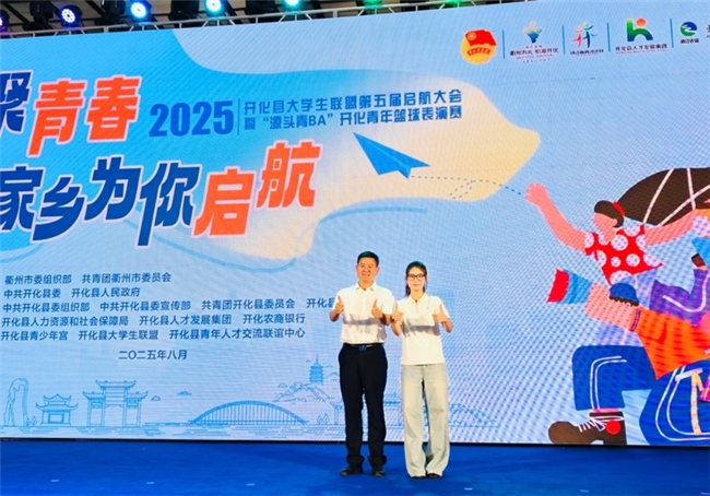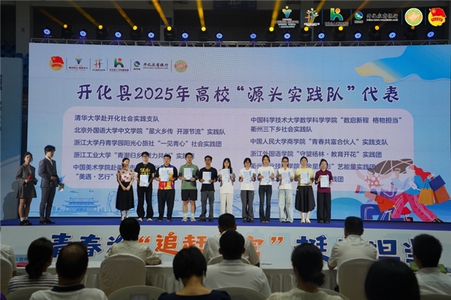 8月15日,在2025年开化县大学生联盟第五届启航大会暨“源头青BA”开化青年篮球表演赛活动上,共青团开化县委对“青潮归乡·聚力共创”实践团队授予暑期“源头实践队”荣誉,对浙江工业大学进行“源头实践礼”表彰。