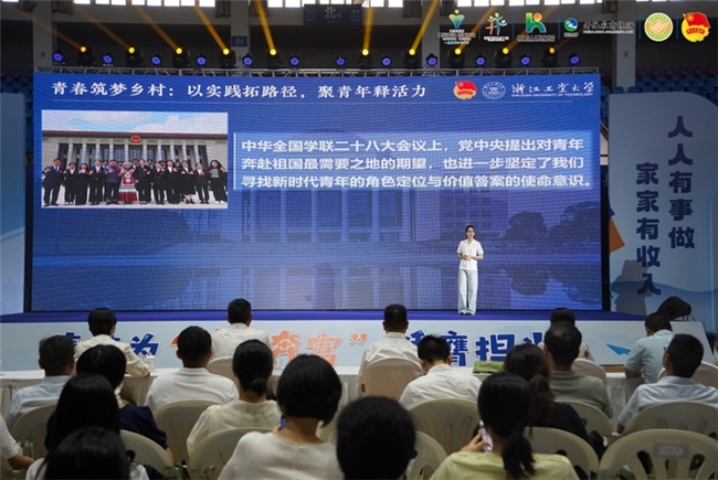 “青潮归乡・聚力共创” 实践团队作为暑期优秀实践队代表,应邀在会上展示团队实践成果。实践团代表以去年5月“开化周暨书记县长进校园”活动的缘分及全国学联二十八大参会感想为起点,分享实践过程中的所见所感,引发对开化青年敢闯敢干精神与暖心政策“双向奔赴”的感慨,强化对未来进一步深化校地合作、号召更多工大青年扎根开化的决心。这场分享生动展现了工大青年扎根实践、服务乡村的使命与担当,涌动着青春赋能乡村振兴的热忱,赢得了在场观众的广泛好评。